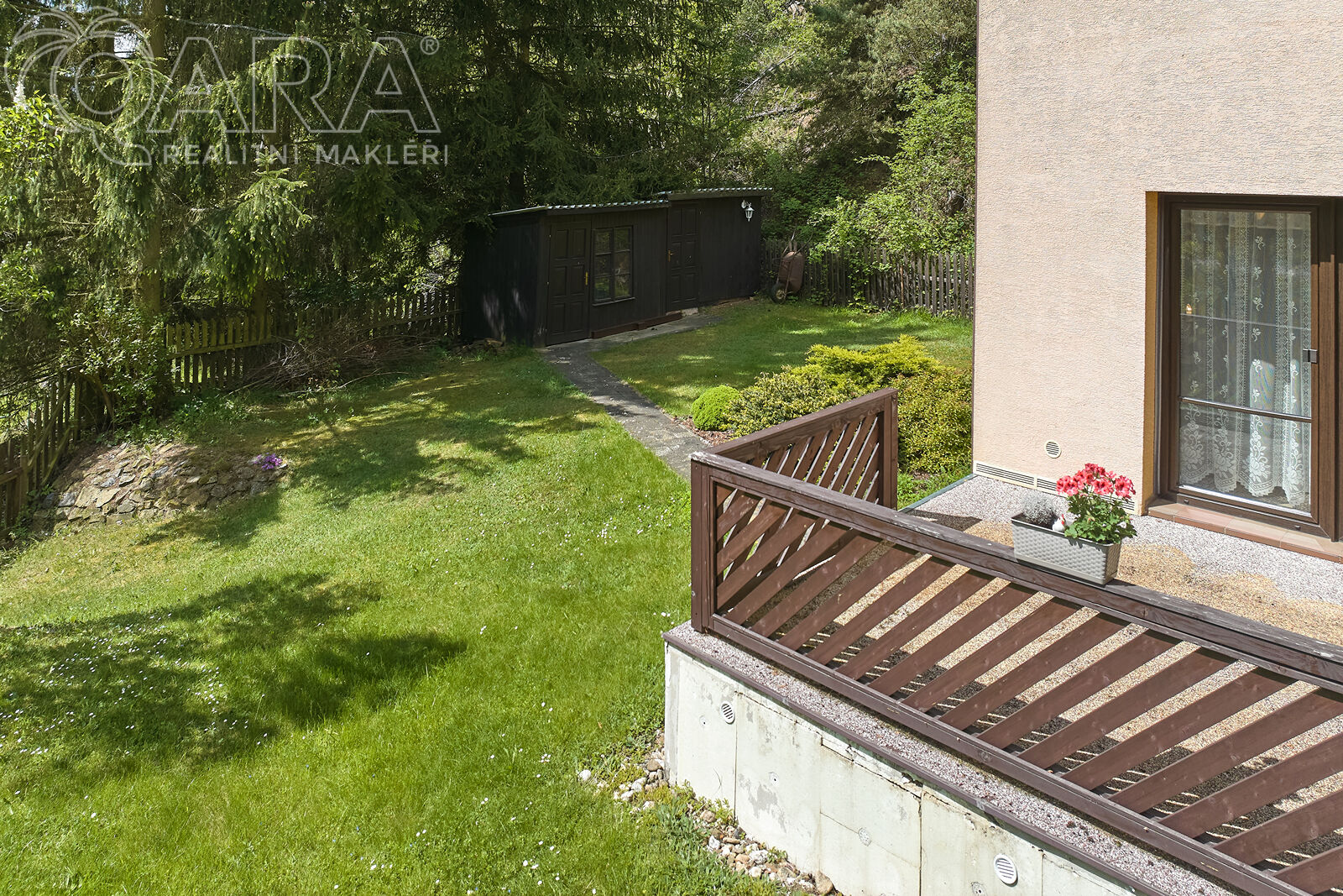 Tento rodinný dům, rekonstruovaný v 90. letech, stojí na pozemku obdélníkového tvaru o velikosti 442 m2. Zahrada je okrasná a k dispozici je také samostatná dřevěná dílna se skladem.