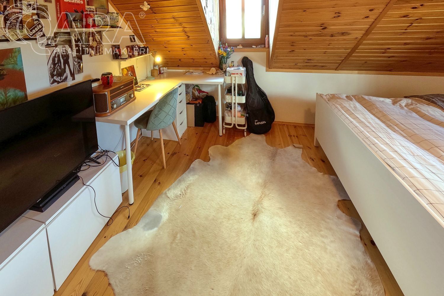 Do patra vede dřevěné schodiště a naleznete tu 3 pokoje, moderní koupelnu se samostatně stojící vanou a samostatné WC.